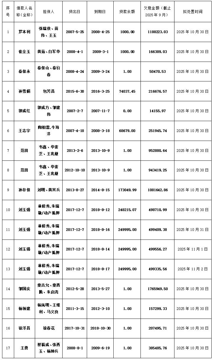 山东单县农村商业银行股份有限公司现对所持有的17笔债权进行招商推介: